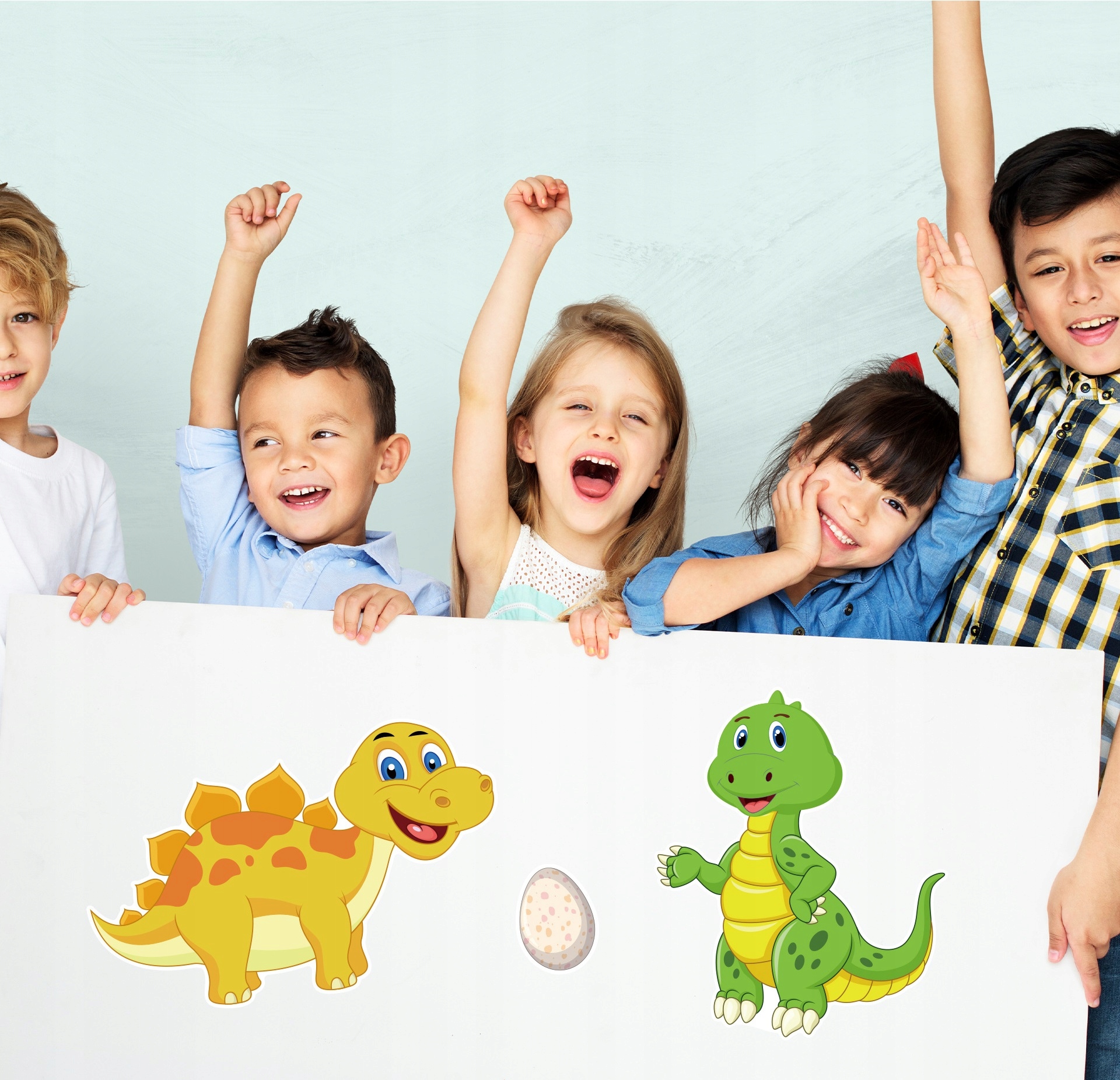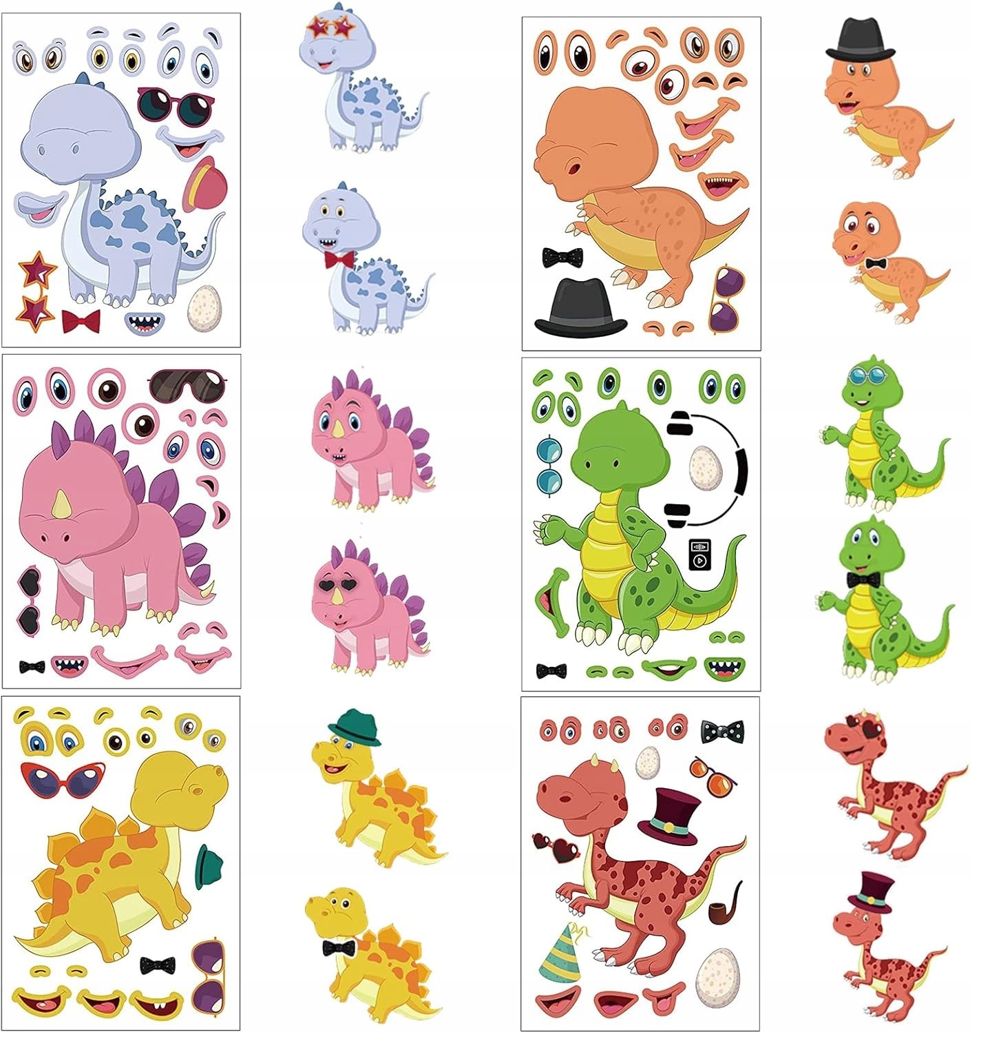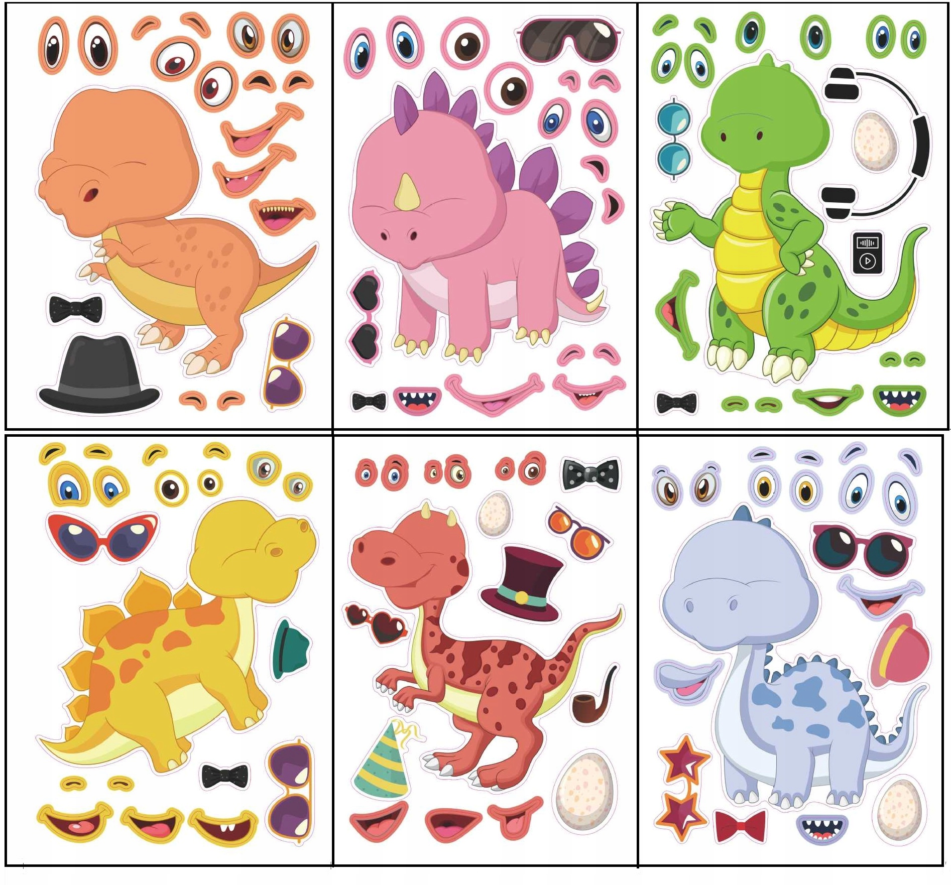 Dzięki naklejkom możesz tworzyć własne, niepowtarzalne kompozycje, zmienić wyraz twarzy dinozaurów oraz dodawać im śmieszne akcesoria.