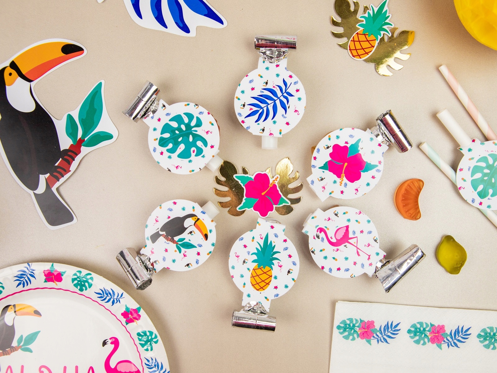 Kolorowe gwizdki trąbki rozwijane ALOHA to must-have każdej imprezy w stylu hawajskim.