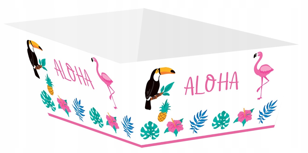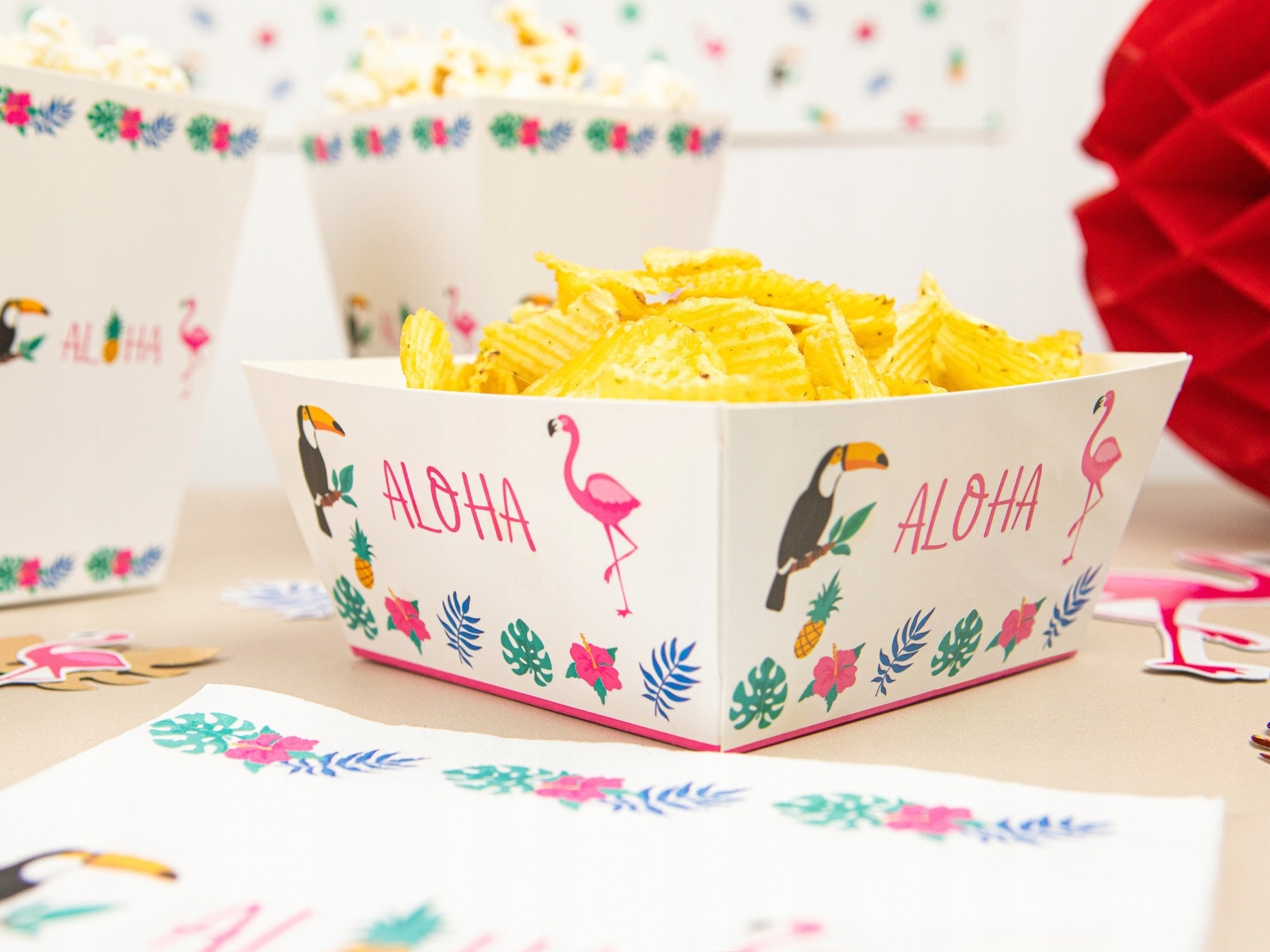 Kolorowe papierowe pudełka na chipsy ALOHA to must-have każdej imprezy w stylu hawajskim.