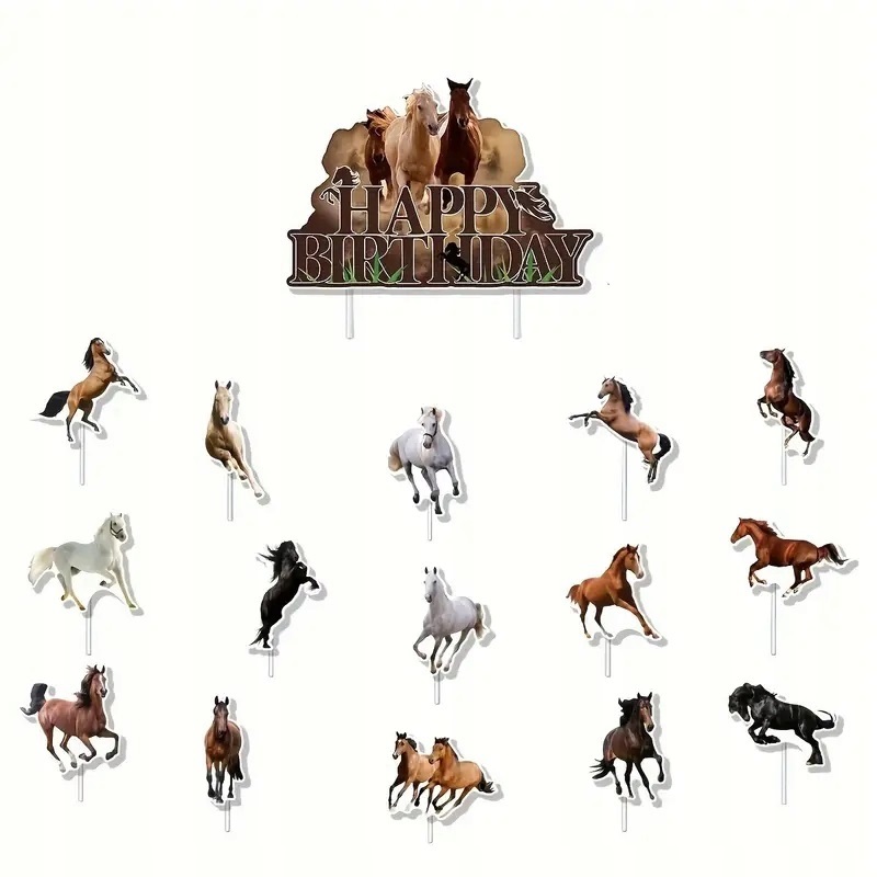 ⭐ Topper Happy Birthday „Konie”- Wymiary około 15×10 cm- 1 sztuka