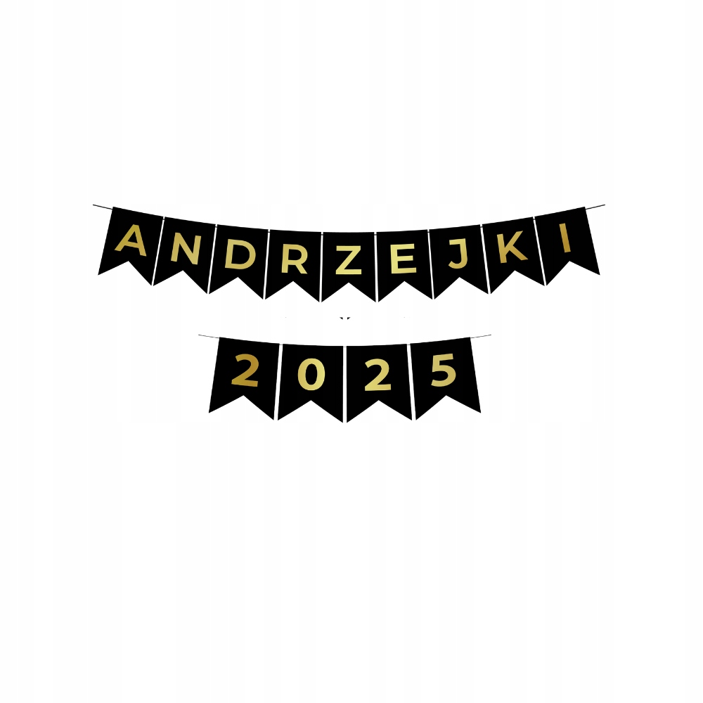 ✅ Baner „ANDRZEJKI 2025”: Kolor flagi: czarny, Kolor liter: złoty, Wymiary pojedynczej flagi 13×15 cm – 1 sztuka