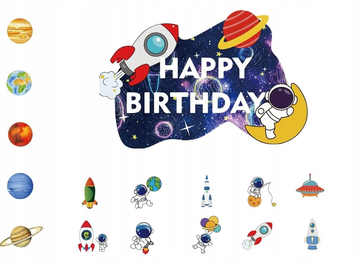 ⭐ Topper na tort Happy Birthday „Kosmos”- Wymiary około 10,5×15 cm – 1 sztuka
