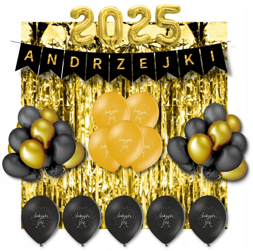 ✅ W skład zestawu wchodzą eleganckie balony, efektowna kurtyna oraz stylowy baner w kolorze czarno złotym.