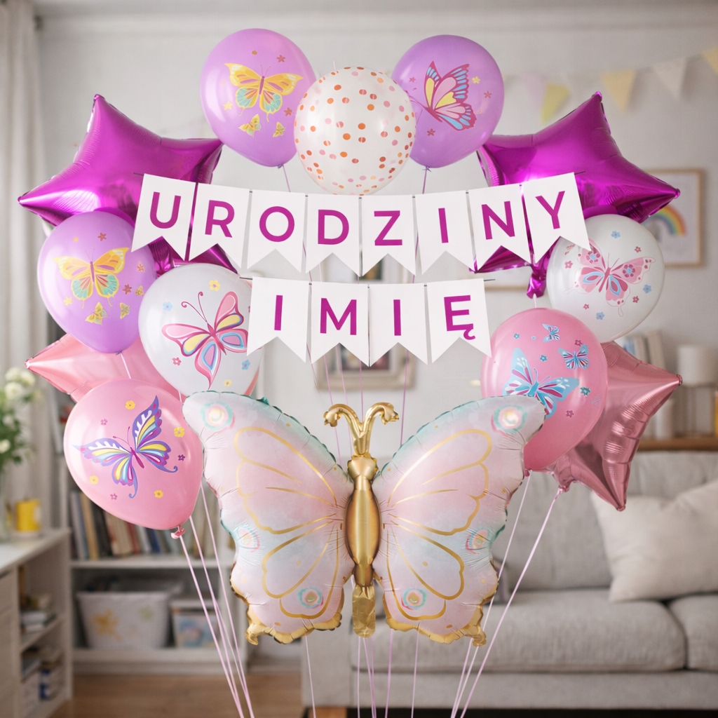 Zestaw urodzinowy Motyl Motylek Motylki Balony Baner Urodziny + Imię